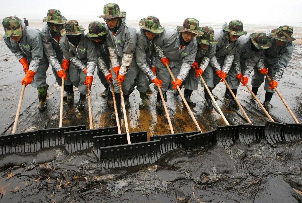 ယိုဖိတ်ရေနံများကိုရှင်းထုတ်နေသောတောင်ကိုးရီးယားလုပ်သားများ