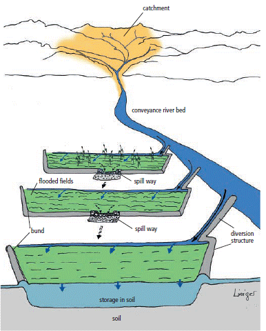 ခြောက်သွေ့ဒေသများတွင် မြေအောက်ရေ၊ မိုးတွင်း၌ရွာသော မိုးရေ အသင့်အတင့်အပြင် ဒေသဝန်းကျင်ရှိ တောင်တန်းများ၊ ကုန်းမြင့်များမှ စီးဆင်းလာသော တောင်ကျရေများကိုလည်း ရယူအသုံးချနိုင်သည်။