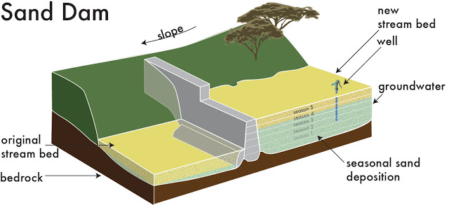 ရေထုထည် ကုဗပေ ၃၅၀၀၀၀ မှ ကုဗပေ ၃၅၀၀၀၀၀၀ အထိသိုလှောင်နိုင် သော သဲတမံများကို ခြောက်သွေ့ဒေသများ၌ တွေ့နိုင်သည်။ အာဖရိကတိုက် ကင်ညာ နိုင်ငံရှိ သဲတမံအများစုသည် ၆ ပေအမြင့်၊ ပေ ၁၂၀ ခန့်ရှည်သည်။ ဘိလပ်မြေ အိတ် ၅၀၀ အပါအဝင် ပစ္စည်းနှင့်လုပ်အားခ အမေရိကန်ဒေါ်လာ ၁၀၀၀၀ ခန့် ကုန်ကျ သည်။ ထိန်းသိမ်းစရိတ်အလွန်နည်းပါးသည်။ သဲတမံတစ်ခုသည် ပျမ်းမျှနှစ်ပေါင်း ၅၀ ခန့်ခံသည်။ ကင်ညာနိုင်ငံရှိ ရေထုထည်ကုဗပေ ၇၀၀၀၀ ခန့်ထိ သိုလှောင်ထားနိုင်သော သဲတမံတစ်ခုက အနီးရှိ ရွာတစ်ရွာအပေါ် အကျိုးပြုနိုင်မှုကို လေ့လာသည့်အခါ ပေါ်ထွက်လာသောရလဒ်မှာ အောက်ပါအတိုင်း ဖြစ်သည်။