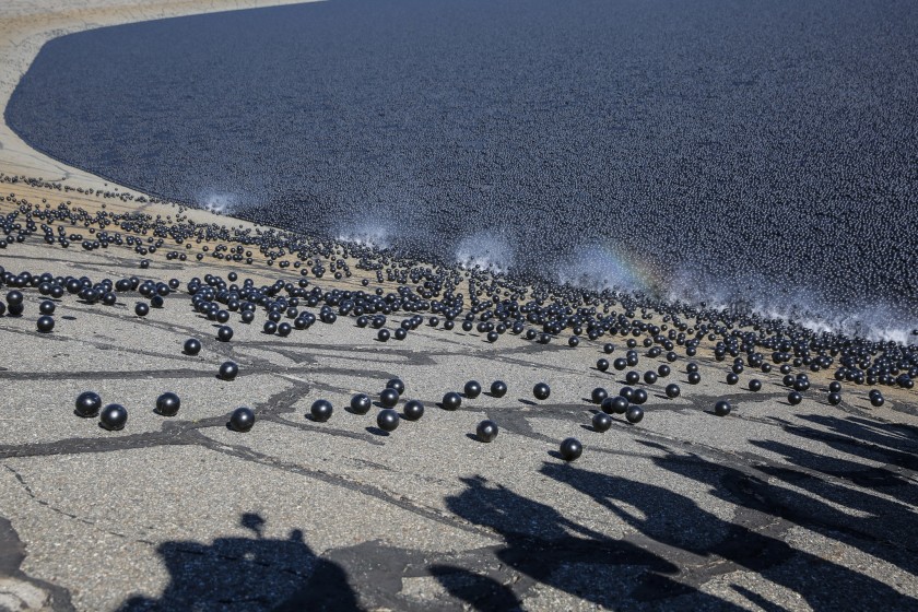 ရေငွေ့ပျံ၍ ကန်ရေဆုံးရှုံးမှုကို ကာကွယ်ရေး ကြိုးပမ်းချက်များအနက် အမေရိကန်နိုင်ငံ လော့စ်အင်ဂျလိစ်မြို့တွင် ပလတ်စတစ်ဘောလုံးများဖြင့် ဖြန့်ကြက်ဖုံးအုပ်ထားကာ အငွေ့ပျံမှုကိုလျော့နည်းစေသည့် သောက်သုံးရေကန် တစ်ခုရှိသည်။ “အရိပ်ရဘောလုံး”ဟုခေါ်သည့် လေးလက်မ အချင်းရှိ ပေါ်လီအက်သလင်း ဘောလုံးများကို အမေရိကန် ဒေါ်လာ ၃၅ သန်းမျှ အကုန်အကျခံ၍ ၂၀၀၈ ခုနှစ်မှစပြီး သောက်ရေကန်ကြီး လေးခုတွင် ဖြန့်ကြက် ဖုံးအုပ်ထားခဲ့သည်။ ယင်းနည်းဖြင့် အငွေ့ပျံမှု ၈၀ ရာခိုင်နှုန်းမှ ၉၀ ရာခိုင်နှုန်းအထိ လျှော့ချနိုင်ခဲ့သည်။ သို့သော် ကန်ကြီးသုံးခုတွင် အရိပ်ရဘောလုံးနှင့် တစ်ဆင့်ခံဆက်နွှယ်သော ရေသန့်စင်ရေးပြဿနာတစ်ခုကြောင့် ရေကန်တစ်ခုတွင်သာ ယင်းဘောလုံးများကို ဆက်လက်အသုံးပြုနေသည်။