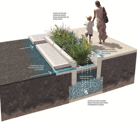 ခေါင်မိုးမြက်ခင်း၊ မျက်နှာစာ ပန်းအိုး၊ မြေပြင်ချိုင့်ခွက်ထဲရှိ အပင်အုပ်စုများသည် မိုးရေကို အချိန် အတိုင်းအတာတစ်ခုအထိ ထိန်းသိမ်းထားပြီးမှ ရေထုတ်မြောင်းထဲသို့ စီးဝင်စေသဖြင့် ယင်းတို့ကို မိုးရေလှောင်ကန်များဟု တင်စားခေါ်ဝေါ်ခြင်း ဖြစ်သည်။ မိုးရေလှောင်ကန်များသည် အကျယ်အဝန်း တစ်စတုရန်းပေလျှင် ရေသုံးဂါလန်ကျော်အထိ ယာယီ ထိန်းသိမ်း သိုလှောင်ထားနိုင်သည်။ အပင်များ စုပ်ယူထိန်းသိမ်းထားသော မိုးရေများကို တိုက်ရိုက်အငွေ့ပျံခြင်း၊ အပင်ထဲမှတစ်ဆင့် ပင်ငွေ့ပျံခြင်းတို့ဖြင့်လည်း ရေထုတ်မြောင်းထဲစီးဝင်သည့် မိုးရေပမာဏကိုလျော့နည်းစေသည်။