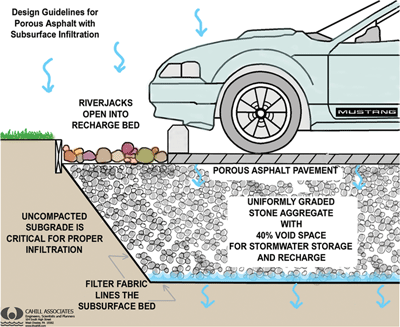 ဆောက်လုပ်ပြီးစီးသည့် ရေမြှုပ်မျက်နှာပြင်များပေါ် မိုးရွာလျှင် တင်ကျန်မနေဘဲ မြေအောက်စိမ့်ဝင် သွားသည်။ ပလက်ဖောင်းများ၊ ကားပါကင်များ၏မျက်နှာပြင်သာ ရေကိုချက်ချင်း စုပ်ယူနိုင်စွမ်း ရှိသည်မဟုတ်၊ ကားပါကင်များတွင် ကားတစ်စီးနှင့်တစ်စီးကြား ခြားထားသော နေရာများ၌ အခြားကားပါကင်များတွင်ကဲ့သို့ မျဉ်းနီလိုင်းတားမထားဘဲ သစ်ပင်နိမ့်များ၊ ချုံပုတ်များနှင့် ခြားထားသည်။ မိုးရေများ မျက်နှာပြင်ပေါ် ချက်ချင်းစီးမသွားဘဲ မြေအောက်သု့ိ စိမ့်ဝင်သွားနိုင်ရန် စီစဉ်ထားခြင်း ဖြစ်သည်။ နေရာအတော်များများ၌ တူးမြောင်းများ၊ ရေကန်များ၊ ရေတိမ်နေရာများ ဖန်တီးပေးထားခြင်းဖြင့် ရေစီးရေလာကောင်းအောင် လုပ်ဆောင်ထားသည်။ ရေကြီးရေလျှံမှုကို လျော့ပါးစေသည့်အပြင် မိုးရေများ မြေအောက်စိမ့်ဝင်ခြင်းကြောင့် မြေအောက်ရေပြင်မြင့်တက်လာကာ သောက်သုံးရေအဖြစ် အသုံးပြုနိုင်ခြင်း အကျိုးကိုလည်း ရသည်။