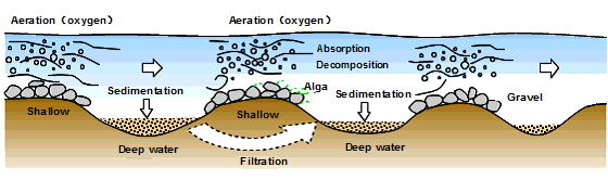 အညစ်အကြေးတွင်ပါဝင်သည့် ရေထက်လေးသော အစိုင်အခဲကြီးငယ်များသည် အနည်ထိုင်ခြင်းဖြင့် ရေစီးထဲမှထွက် ကျန်ရစ်သည်။ မြစ်ကြမ်းပြင်၌ ထိုင်ကျန်သော အန္တရာယ်ရှိဇီဝဓာတုပစ္စည်းများသည် အညစ်အကြေးတွင်ပါဝင်သည့် ဘက်တီးရီယားတို့၏ ဓာတ်ပြုမှုကြောင့် တဖြည်းဖြည်းဓာတ်ပြိုကွဲလျက် အန္တရာယ်မရှိသော ဇီဝဓာတုပစ္စည်းများအဖြစ်သို့ရောက်သည်။
