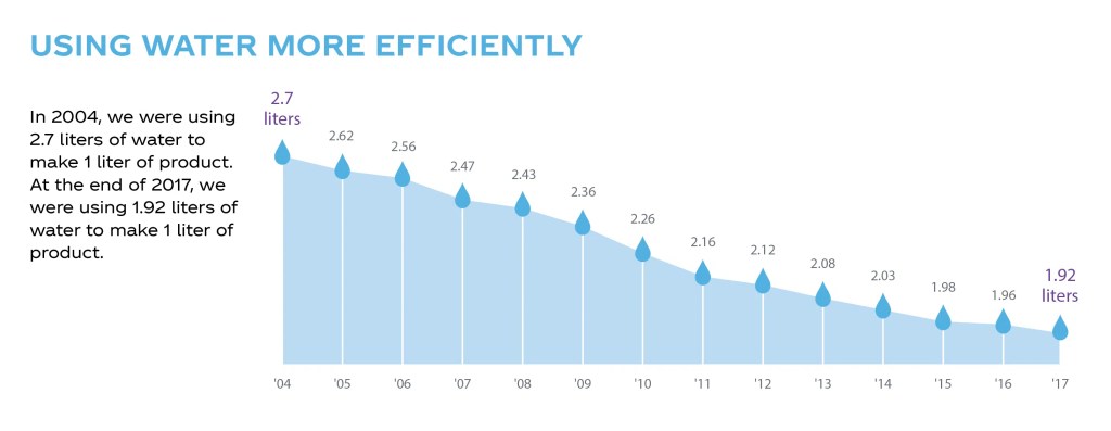 ရေအသုံးလျှော့ချနေသော လုပ်ငန်းကြီးများထဲတွင် ကိုကာကိုလာလည်း ပါသည်။ ကိုကာကိုလာသည် ၂၀၀၄ ခုနှစ်တွင် ကိုကာကိုလာတစ်လီတာထုတ်တိုင်းရေ ၂ . ၇ လီတာသုံးခဲ့ရသည်။ ပုလင်း၊ စက်ကိရိယာ စသည်တို့ကို ဆေးကြောရာ၌ ရေများများ သုံးရသောကြောင့်ဖြစ်သည်။ နောက်ပိုင်းတွင် ရေချွေတာရေး ကြိုးပမ်းချက်ဖြင့် ကိုကာကိုလာ တစ်လီတာအတွက် ရေ ၁ . ၉၂ လီတာသာသုံးရတော့သည်အထိ လျှော့ချနိုင်ခဲ့သည်။ ၂၀၂၀ ပြည့်နှစ်တွင်မူ ကိုကာကိုလာစက်ရုံအချို့သည် ကိုကာကိုလာ တစ်လီတာအတွက် ရေ ၁ . ၄၀ လီတာသာ သုံးတော့သည်။