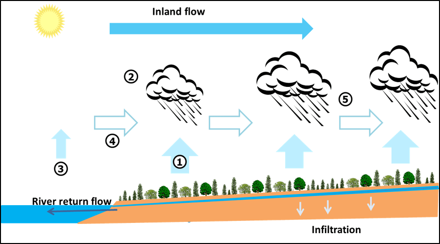 ပုံမှန်ဆိုလျှင် ပင်လယ်လေများ ကုန်းတွင်းသို့ဝင်ရောက်ရာတွင် ရေငွေ့များကို မိုင်ရာဂဏန်းအကွာအထိသာ သယ်သွားနိုင်သည်။ ထို့ထက်ပို၍ ဝေးဝေးမသယ်နိုင်။ သို့သော် တောင်အမေရိကတိုက် အယ်မဇုန် အပါအဝင် မြစ်ဝှမ်းအချို့တွင် ကုန်းတွင်းပိုင်း မိုင်ထောင်နှင့်ချီသောနေရာများတွင် မိုးရွာနေသည်ကို ထောက်လျှင် ကမ်းရိုးတန်းသစ်တောများက ရေငွေ့ပါသည့် ပင်လယ်လေများကို စုပ်ယူ၍ ကုန်းတွင်း မိုင်ရာဂဏန်းသို့ပို့၊ ယင်းနေရာရှိသစ်ပင်များက ပင်ငွေ့ပျံ၊ ငွေ့ရည်ဖွဲ့၊ လေဖိအားလျော့၊ လေများတိုးဝင် စသဖြင့် အဆင့်ဆင့် စုပ်ယူ တွန်းပို့ပေးသောကြောင့်သာ ဖြစ်နိုင်သည်ဟု ရုရှားပညာရှင်နှစ်ဦးကဆိုသည်။