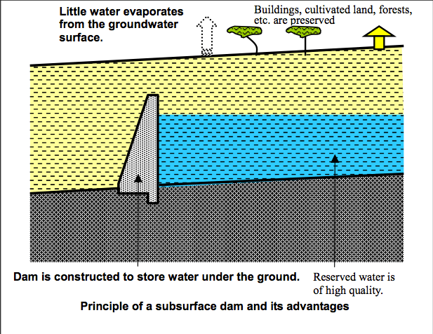 သဲတမံဆိုတာကို လေ့လာလိုက်တော့ သဲနဲ့လုပ်ထားတဲ့ မြေပေါ်တမံတင်မဟုတ်ဘူး၊ သဲချောင်းတွေရဲ့ မျက်နှာပြင်အောက် သဲထုထဲမှာဆောက်ပြီး သဲနဲ့ပဲ ပြန်ဖုံးထားတဲ့ မြေအောက်သဲတမံ (Underground Sand Dam) ကိုလည်း ဆောက်လုပ်နိုင်ကြောင်း သိလာရပါတယ်။ သဘောက သဲချောင်းတွေရဲ့ သဲထုထဲမှာ စီးနေတဲ့ရေကို အလဟသစီးမသွားစေဘဲ တားထား သိုလှောင်ထားပြီး လိုတဲ့အခါ ထုတ်သုံးကြဖို့ပါပဲ၊ ဒါ့ကြောင့် မိုးအခါရေစီးပြီး မိုးမရွာတော့ရင် ခြောက်သွားတဲ့ သဲချောင်းရှိတဲ့ ဒေသတိုင်းမှာ သဲတမံဆောက်နိုင်ပါတယ်။ အောက်ပုံကိုကြည့်ပါ။