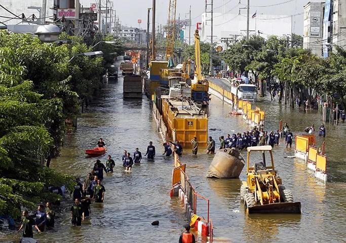 ထိုင်းနိုင်ငံ (Thailand) ၏ မြို့တော် ဘန်ကောက် (Bangkok) သည် ကျောက်ဖယား မြစ်ဝကျွန်းပေါ်ဒေသ အတွင်း လုံးလုံးလျားလျား ကျရောက်တည်ရှိသည်။ ၂၀၁၁ ခုနှစ်တွင် ကျောက်ဖယားမြစ် (Chao Phraya River) ရေကြီး ရေလျှံခြင်းကြောင့် ဘန်ကောက် မြို့တော်သည် လပေါင်းများစွာ ရေလွှမ်းမိုးမှု ဘေးအန္တရာယ်ကို ရင်ဆိုင် ကြုံတွေ့ခဲ့ရသည်။ ထိုင်းနိုင်ငံ၏ စီးပွားရေးမှာ အကြီးအကျယ် ထိခိုက်ဆုံးရှုံးမှုများ ဖြစ်ပေါ်ခဲ့ရသည်။ အကျိုးဆက်အားဖြင့် တစ်ကမ္ဘာလုံး၌ ကွန်ပျူတာ ဟာ့ဒစ်ခ် (hard-disk) ဈေးနှုန်းများအပေါ် သိသာ ထင်ရှားသော အကျိုးသက်ရောက်မှုများကို ဖြစ်ပေါ်စေခဲ့ပါသည်။