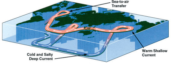 ကမ္ဘာ့ ရွေ့လျားခါးပတ် ရေစီးကြောင်းသည် မိမိ၏ အပူဓာတ်ကို စွန့်ထုတ်ခဲ့ရသဖြင့် ဥရောပတိုက်ကို လွန်သော် ရေအပူချိန် ကျဆင်းလာသည်။ စီးလာရာ လမ်းတစ်လျှောက်တွင် အပူဓာတ်ကြောင့် ရေအချို့ အငွေ့ပျံသွားကြသဖြင့် အငန်ဓာတ် ပိုများလာသည်။ ပို၍ သိပ်သည်းလာသည်။ အတ္တလန်တိတ် သမုဒ္ဒရာ မြောက်ပိုင်း အိုက်စလန်ကျွန်းအနီးသို့ ရောက်သော် အောက်ခြေမှ ရေများထက် ပိုလေးလာသဖြင့် အောက်ပိုင်းသို့ မြုပ်ဆင်းကာ ရေအောက် ရေအေးစီးကြောင်း အဖြစ်နှင့် သမုဒ္ဒရာကြမ်းပြင်ကို ရှပ်၍ စီးရင်း အာဖရိကတောင်ပိုင်းနှင့် သြစတေးလျအောက်ပိုင်းတို့ကို ဖြတ်၍ ပစိဖိတ်သမုဒ္ဒရာသို့ ပြန်ရောက်သည်။