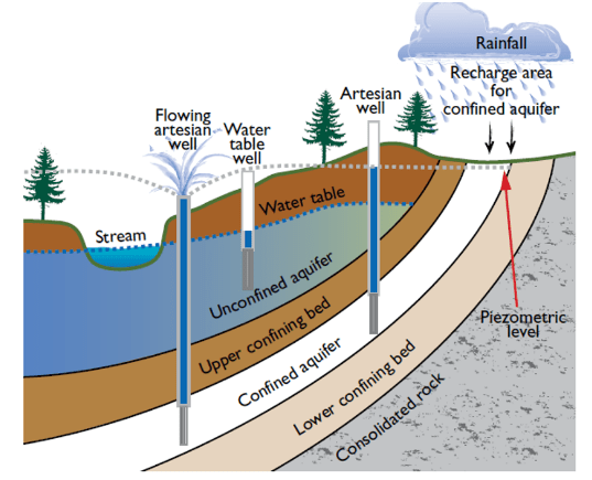 မြေအောက်ရေများ ခိုအောင်း တည်ရှိနေသဖြင့် ရေအောင်းလွှာ (Aquifer) ဟု ခေါ်သော အဓိက မြေလွှာ နှစ်မျိုး ရှိသည် (ပုံ)။ အပေါ်ပိုင်းရှိ ရေအောင်းလွှာသည် ရေမစိမ့်နိုင်သော သို့မဟုတ် ရေစိမ့်နှုန်း နည်းသော မြေလွှာ (confining bed) ပေါ်၌ ရှိသည်၊ ယင်းမြေလွှာပေါ်၌ ရေပိတ်လွှာ မရှိသဖြင့် ဖိအားမဲ့ ရေအောင်းလွှာ (unconfined aquifer) ဟု ခေါ်သည်၊ ဖိအားမဲ့ ရေအောင်းလွှာရှိ ရေတွင်း (အလယ်တွင်း)၏ ရေပြင်သည် တွင်းဘေး ရေအောင်းလွှာရှိ ရေပြင်နှင့် အညီ ဖြစ်နေ၍ water table well ဟုလည်း ခေါ်သည်။