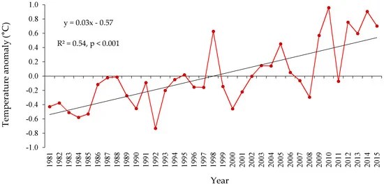 ဤလေ့လာချက်သည် မြန်မာနိုင်ငံ၌ ၁၉၈၁ ခုနှစ်မှ ၂၀၁၅ ခုနှစ်အတွင်း မိုးလေဝသစခန်း ၃၅ ခု၏ တိုင်းတာချက်များကို အသုံးပြု၍ အစွန်းရောက် နေ့စဉ်အပူချိန်နှင့် မိုးရေချိန်များ နှစ်စဉ်ပြောင်းလဲလာပုံကို လေ့လာသည်။ ယင်းလေ့လာချက်အရ မြန်မာနိုင်ငံ၌ သိသာစွာ ပူပြင်းလာနေသောအချက်ကို တွေ့ရှိသည်။ ၂၀ဝ၉ ခုနှစ်မှ ၂၀၁၅ ခုနှစ်အတွင်း အပူချိန်မြင့်မားလာမှုသည် ၂၀၁၁ ခုနှစ်မှလွဲ၍ နှစ်စဉ် ဝ ဒသမ ၅ ဒီဂရီ စင်တီဂရိတ်စီ တက်လာနေခဲ့သည်။ ၂၀ဝ၀ ပြည့်နှစ်နောက်ပိုင်း အနိမ့်ဆုံးနှင့် အမြင့်ဆုံးအပူချိန်များသည် တောက်လျှောက် မြင့်မားလာနေခဲ့သည်။ ပူပြင်းသောနေ့နှင့်ညများသည် များပြားလာနေပြီး အေးသောနေ့နှင့်ညများ လျော့နည်းသွားသည်။