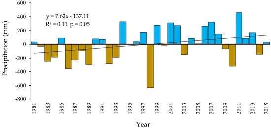 ၂၀၁၈ ခုနှစ်နှင့် ၂၀၁၅ ခုနှစ်ကြားကာလတွင် ၁၉၈၁ နှင့် ၂၀၁၅ အတွင်း မိုးရွာသွန်းမှု များလာသော်လည်း သိသိသာသာ မဟုတ်ချေ။ ယင်းကာလအတွင်း ဆယ်စုနှစ်တစ်ခုလျှင် ၇၆ ဒသမ ၅၂ မီလီမီတာနှုန်းဖြင့်သာ မိုးပိုလာခဲ့သည်။