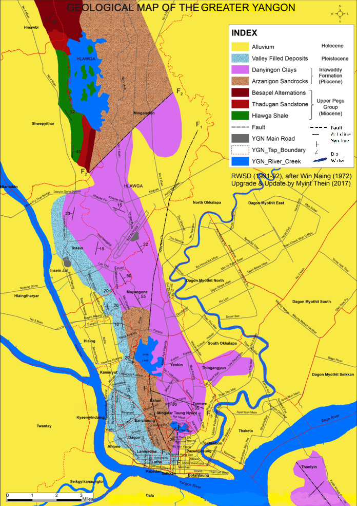 ရန်ကုန်တဝိုက်တွင် ရှိသည့် အောက်ခံကျောက်လွှာများမှာ ယေဘုယျအားဖြင့် နုန်းမြေနှင့် ချိုင့်ဝှမ်း ပို့ချ မြေလွှာ၊ ရွှံ့၊ သဲကျောက်နှင့် ပေါင်းစပ်ဖွဲ့စည်းထားသော ဧရာဝတီဖော်မေးရှင်း(ဖွဲ့စည်းမှု)နှင့် ပဲခူးအုပ်စုတို့ ဖြစ်ပါသည်။ ဧရာဝတီကျောက်လွှာအုပ်စုတွင် သက်တန်း ပိုရင့်သော သဲကျောက်၊ ရွှံ့ကျောက် ရွှံ့လွှာအပျော့နှင့် သဲများကို တွေ့ရသည်။ ပဲခူးအုပ်စုဝင် မာကျောကျစ်လစ်သော ယှေလကျောက်များကို လှော်ကားကန်အနောက်နှင့် အနောက်မြောက်ဘက်များ၌ တွေ့ရသည်။