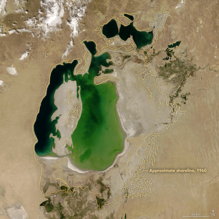 ရေမျက်နှာပြင်ဆုတ်သွား၍ ကမ်းစပ်မြို့များသည် ရေပြင်နှင့်မိုင်ပေါင်းများစွာဝေးသွားသည်။ မိုးခေါင်သော ကာလများတွင် ရေအငွေ့ပျံမှုများသဖြင့် မူလကပင်လယ်ကြမ်းပြင်သည် ကန္တာရကြီးများ ဘဝသို့ ရောက်သွားသည်။ ရေမရှိ၍ပေါ်လာသော မြေပြင်ကြီးတွင် ဆားများသာမဟုတ်၊ စိုက်ခင်းများမှထွက်လာသော ဓာတ်မြေသြဇာနှင့် ပိုးသတ်ဆေးအြွကင်းအကျန်များပါ ရောယှက်နေသည်။ ဆား၊ ဓာတ်မြေသြဇာနှင့် ပိုးသတ်ဆေး အြွကင်းအကျန်များသည် လေပြင်းတိုက်တိုင်း ဖုန်မှုန့်များနှင့်အတူ ဒေသတွင်းသို့ ပျံ့နှံ့ ရောက်ရှိကြသည်။ ပင်လယ်ကြမ်းပြင်မှ လေပြင်းနှင့်အတူလွင့်ထွက်သောဖုန်မှုန့်များ၏ ပမာဏသည် တစ်နှစ်လျှင် တန်ချိန် ၇၇ သန်းမျှ ရှိသည်။