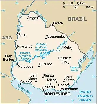 မြို့တော် မွန်တေဗီဒေးယို(Montevideo)သည် နိုင်ငံ၏တောင်ဘက် ရီယိုဒယ်လာပလာတာမြစ်ဝ၊ အတ္တလန်တိတ်သမုဒ္ဒရာ ကမ်းခြေ၌ တည်ရှိပြီး လူဦးရေ ၁၇၀ဝဝဝ၀ ကျော် နေထိုင်သည်။ နိုင်ငံလူဦးရေ၏ ထက်ဝက်ခန့်နေသော မွန်တေဗီဒေးယိုမြို့တော်အတွက် ရေကို ရေလှောင်တမံများမှ အဓိကပေးဝေသည်။