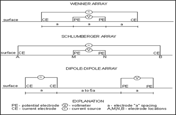 ဤညီမျှခြင်း၌ K သည် လျှပ်ကူးပစ္စည်း ၄ ခု (4 Electrodes) ကို သုံး၍ ရရှိမည့် (pa) တန်ဖိုးကို တွက်ချက်ရာတွင် သုံးသည့် လျှပ်ကူးပစ္စည်းလေးခုပေါ် မူတည်သော ဂျီသြမေတြီကိန်းသေတန်ဖိုး (geometric factor) ဖြစ်သည်။ လျှပ်စစ်လွှတ်ခုခံမှုတိုင်းနည်းတွင် လျှပ်ကူးပစ္စည်း(လျှပ်စစ်ငုတ်) အစီအစဉ်ထားရှိမှု electrode arrangement) ကို လျှပ်ကူးပစ္စည်းစီစဉ်ထားမူ (Array)ဟုခေါ်ကြသည်။ အခြားသော လျှပ်ကူးပစ္စည်း (Array)များမှာ (Wenner, Schlumberger) နှင့် (dipole- dipole) ခင်းကျင်းခြင်းတို့ဖြစ်သည်။ အခင်းအကျင်းခြင်းပုံသဏ္ဍန်များကို ပညာဗဟုသုတအဖြစ် အောက်တွင် ဖော်ပြထားသည်။