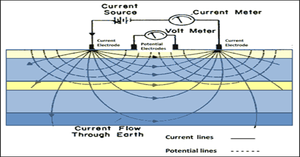 ၃။ လျှပ်စစ်ခုခံမှုတိုင်းတာနည်းသည် ပုံမှန်အားဖြင့် လျှပ်စစ်စီးပစ္စည်းနှစ်ခု (two current electrodes C1and C2) ကတစ်ဆင့် မြေကြီးထဲသို့ လျှပ်စစ်စီးဆင်းစေပြီး လျှပ်စစ်စွမ်းအား ပြန်လည် တုံ့ပြန်ပေးသည့် လျှပ်စစ်ငုတ်နှစ်ခု (two potential electrodes / P1 and P2)တွင် လျှပ်စစ်ဗို့အားကွာခြားမှုကို တိုင်းတာသည်။ လျှပ်စစ်စီကြောင်း (I) နှင့် ဗို့အား (V) တို့၏ တန်ဖိုးညီမျှခြင်းမှာ –