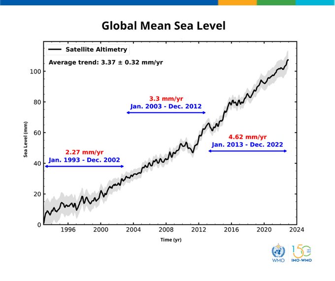 ဂြိုဟ်တုများဖြင့် စတင်တိုင်းတာခဲ့သော ၁၉၉၃ ခုနှစ်နှင့် ၂၀ဝ၂ ခုနှစ်ကြားတွင် ကမ္ဘာ့ပျမ်းမျှ ပင်လယ်ရေ မျက်နှာပြင်သည် တစ်နှစ်လျှင် ၂ ဒသမ ၂၇ မီလီမီတာ တက်ခဲ့ပြီး ၂၀ဝ၃ ခုနှစ်နှင့် ၂၀၁၂ ခုနှစ်အတွင်း တစ်နှစ်လျှင် ၃ ဒသမ ၃ မီလီမီတာ တက်ခဲ့ကာ ၂၀၁၃ ခုနှစ်နှင့် ၂၀၂၂ ခုနှစ်ကြားတွင် တစ်နှစ်လျှင် ၄ ဒသမ ၆၂ မီလီမီတာ တက်ခဲ့သည်။ လွန်ခဲ့သောနှစ်ပေါင်း ၃၀ အတွင်း ရေပြင်မြင့်တက်နှုန်း တစ်နှစ်လျှင် ၃ ဒသမ ၃၇ မီလီမီတာ ဖြစ်သည်။