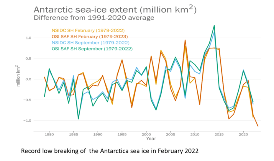 အန္တာတိက ပင်လယ်ရေခဲပြင်၏ စုစုပေါင်း အကျယ်အဝန်းသည် ၂၀၂၂ ခုနှစ် ဖေဖော်ဝါရီလ ၂၅ ရက်က စတုရန်းကီလိုမီတာ ၁ ဒသမ ၉၂ သန်း ဖြစ်ရာ တိုင်းတာခဲ့သမျှတွင် အသေးငယ်ဆုံး ဖြစ်သည်။ ၁၉၉၁ ခုနှစ်နှင့် ၂၀၂၀ ပြည့်နှစ်ကြား ပျမ်းမျှဧရိယာထက် စတုရန်းကီလိုမီတာ တစ်သန်း သေးငယ်သည်။ ၂၀၂၂ ခုနှစ်အကုန်အထိ အန္တာတိက ပင်လယ်ရေခဲပြင်၏ ဧရိယာသည် ပျမ်းမျှအောက်တွင်သာ ရှိခဲ့သည်။