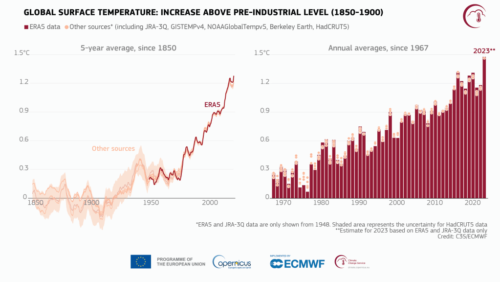 ကမ္ဘာ့ရာသီဥတုပြောင်းလဲခြင်း လေ့လာရေး အချက်အလက်များအားလုံး (JRA-3Q, Berkeley Earth, GISTEMPv4, HadCRUT5 and NOAAGlobalTempv5) က ၂၀၂၃ ခုနှစ် ကမ္ဘာ့ပျမ်းမျှအပူချိန်သည် ၁၈၅၀-၁၉၀ဝ အတွင်း ပျမ်းမျှအပူချိန်နှင့်စာလျှင် ၁ ဒသမ ၄ ဒီဂရီ ဆဲလ်စီးယပ်စ်နှင့် ၁ ဒသမ ၅ ဒီဂရီ ဆဲလ်စီးယပ်စ်ကြား မြင့်တက်ခဲ့ကြောင်း ပြသသည်။