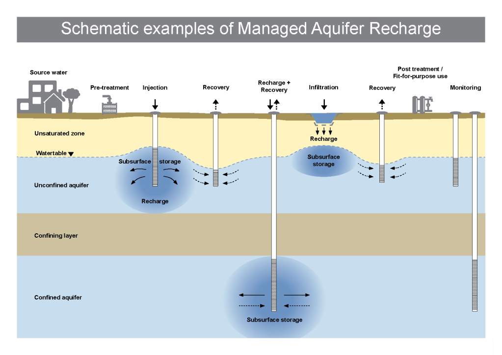 စီမံခန့်ခွဲမှုဖြင့် မြေအောက်ရေဖြည့်သွင်းခြင်း သရုပ်ပြပုံ။ မိုးရေ မြစ်ရေတို့ကို ပဏာမသန့်စင်၍ ဖိအားမဲ့ မြေအောက်ရေအောင်းလွှာရှိ ဝဲဘက်အစွန်တွင်းထဲသို့ ဖြည့်သွင်းသည်။ ဖြည့်ထားသော ရေများကို ပြန်လည် အသုံးပြုရန် လိုသည့်အချိန်တွင် ဝဲဘက်မှရေလျှင် ဒုတိယမြောက်တွင်းဖြင့် ပြန်လည်ထုတ်ယူအသုံးချသည်။ ဖိအားရှိရေအောင်းလွှာတွင်းသို့ ရေဖြည့်ခြင်း၊ ပြန်ထုတ်ခြင်းတို့ကို ဝဲဘက်မှ တတိယတွင်းဖြင့် လုပ်ဆောင်သည်။ တတိယတွင်း၏ ယာဘက်၌ ရှိသည့် ရေစုကန်မှလည်း ဖိအားမဲ့ရေအောင်းလွှာထဲသို့ ဖြည့်ပေးသည်။ ယာဘက်အစွန်မှ တွင်းနှစ်တွင်းသည် ဖိအားမဲ့ရေအောင်းလွှာနှင့် ဖိအားရှိရေအောင်းလွှာတို့ထဲတွင် သိုလှောင်ထားသော ရေအနိမ့်အမြင့်ကို တိုင်းတာသည်။