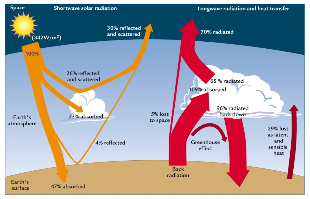 လေထုတွင်းရှိ ဖန်လုံအိမ်ဓာတ်ငွေ့နှင့် ရေငွေ့၊ ရေခဲမှုန်နှင့် ရေစက်ငယ်များဖြင့် ဖွဲ့စည်းတည်ရှိသော တိမ်တိုက်တို့သည် ကမ္ဘာ့မျက်နှာပြင်က ထုတ်လွှတ်သော အနီအောက် ရောင်ခြည်ကို စုပ်ယူလိုက်ပြီးနောက် တဖန် ပြန်လည်ထုတ်လွှတ်သည်။ ပြန်ထုတ်လိုက်သော ရောင်ခြည်၏ ထက်ဝက်ခန့်သည် လေထု၏ အပေါ်ဘက်သို့ တက်သွားပြီး ထက်ဝက်ခန့်သည် လေထုအောက်ပိုင်းကို ဖြတ်၍ မြေပြင်ပေါ် ပြန်ကျသည်။