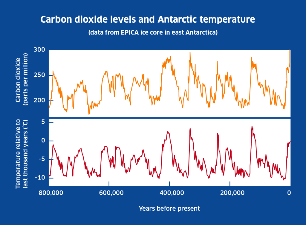 အပေါ်ပုံသည် လွန်ခဲ့သည့် နှစ်ပေါင်း ၈၀ဝဝဝ၀ ခန့်အတွင်း ကမ္ဘာ့လေထုတွင်းရောက် ကာဘွန်ဒိုင်အောက်ဆိုက် ပမာဏ အပြောင်းအလဲနှင့် တောင်ဝင်ရိုးစွန်းဝန်းကျင် အန္တာတိကတိုက်၏ အပူချိန် အပြောင်းအလဲကို နှိုင်းယှဉ်ပြသသောပုံ ဖြစ်သည်။ ယင်းကာလအတွင်း ကာဘွန်ဒိုင်အောက်ဆိုက်နှင့် ကမ္ဘာ့အပူချိန်တို့သည် သူတက်ကိုယ်တက် သူကျကိုယ်ကျဖြင့် အတက်အကျ ညီနေခဲ့ကြောင်း ပုံတွင် မြင်နိုင်သည်။
