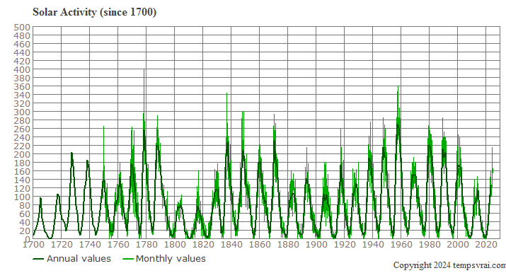 ပုံပါ ဂရပ်မျဉ်းသည် ၁၇၀ဝ ပြည့်နှစ်မှစ၍ ၂၀၂၃ ခုနှစ်အထိ နေ၏လှုပ်ရှားမှု အနည်းအများ၊ တစ်နည်းဆိုရလျှင် ကမ္ဘာပေါ် ကျရောက်လာသော နေရောင်စွမ်းအင် အနည်းအများကို ပြသည်။ ယင်းဂရပ်မျဉ်းအရ ဖော်ပြပါကာလအတွင်း နေရောင်စွမ်းအင် အပြောင်းအလဲသည် ပြောပလောက်အောင် မများသဖြင့် နေကြောင့် ပိုပူလာခြင်း မဖြစ်နိုင်ပေ။