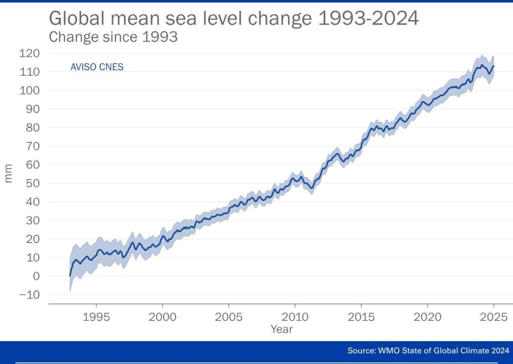 ကမ္ဘာ့မိုးလေဝသအဖွဲ့၏ ထုတ်ပြန်ချက်အရ ပင်လယ်ရေပြင်တက်နှုန်းသည် ၂၀၁၅ ခုနှစ်က တစ်နှစ်လျှင် ၂ ဒသမ ၁ မီလီမီတာနှုန်းဖြင့် တက်ခဲ့ပြီး ၂၀၂၄ ခုနှစ်၌ တစ်နှစ်လျှင် ၄ ဒသမ ၇ မီတာနှုန်း မြင့်တက်ခဲ့သဖြင့် ရေပြင်မြင့်တက်နှုန်းသည် ၁၀ နှစ်အတွင်း နှစ်ဆကျော် ပိုမိုလာခဲ့သည်။ ၂၀၂၄ ခုနှစ်၌ ပင်လယ်ရေပြင်သည် ၁၉၉၃ ခုနှစ်ကနှင့်စာလျှင် ၁၁၃ မီလီမီတာခန့် ပိုမိုမြင့်တက်ခဲ့သည်။