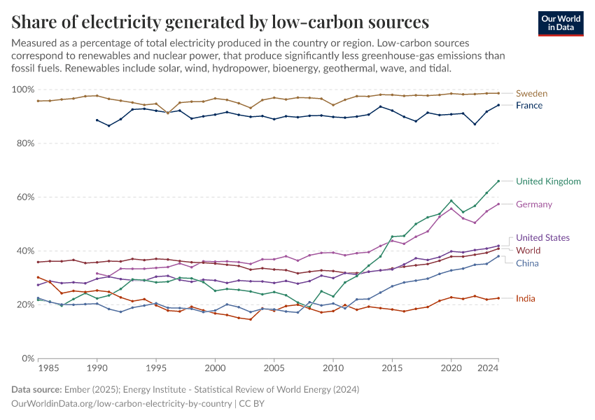 ကာဘွန်အထွက်နည်းသော ရေအား၊ လေအား၊ ဆိုလာ၊ နျူကလီးယား၊ ဇီဝလောင်စာ၊ ဘူမိအပူ၊ ရေလှိုင်းစွမ်းအင်၊ ဒီရေစွမ်းအင်တို့ကို သုံး၍ လျှပ်စစ်ထုတ်လုပ်ရာ၌ ဆွီဒင်နှင့် ပြင်သစ်တို့က အခြားနိုင်ငံများထက် သိသာစွာ များပြားသည်။