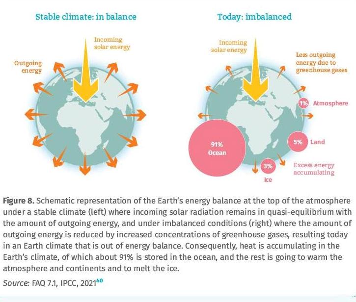 လေထုတွင်း ယခင်ကထက် ပိုမိုများပြားလာသောစွမ်းအင်များ၏ ၉၁ ရာခိုင်နှုန်းကို သမုဒ္ဒရာရေထုက လည်းကောင်း၊ ၅ ရာခိုင်နှုန်းကို ကမ္ဘာမြေပြင်က လည်းကောင်း၊ ၃ ရာခိုင်နှုန်းကို ရေခဲပြင်များက လည်းကောင်း စုပ်ယူသည်။ လေထုတွင်း၌ ၁ ရာခိုင်နှုန်း ကျန်သည်။