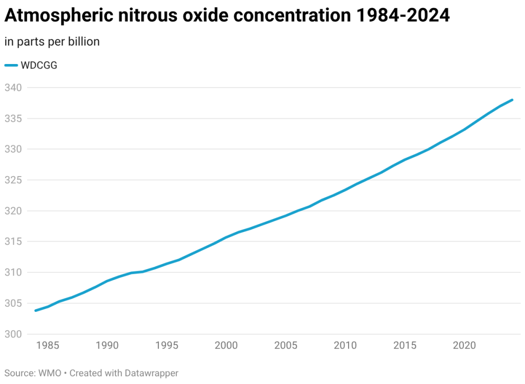 နိုက်ထရပ်စ်အောက်ဆိုက်သည် ကမ္ဘာကို ပူနွေးစေရာတွင် ကာဘွန်ဒိုင်အောက်ဆိုက်ထက် အဆ ၃၀ဝ ပိုမို အားကောင်းသည့်အပြင် လေထုတွင်း၌ နှစ်ပေါင်း ၂၀ဝ ခန့်အထိ တည်နေနိုင်သဖြင့် အထူးသတိပြုရမည့် ဓာတ်ငွေ့ ဖြစ်သည်။ နိုက်ထရပ်စ်အောက်ဆိုက်ပမာဏသည် ထုထည်အားဖြင့် ၃၃၈ ပီပီဘီသို့ ရောက်ရှိရာ ၁၇၅၀ ပြည့်နှစ်ကထက် ၁၂၅ ရာခိုင်နှုန်း များပြားလာသည်။