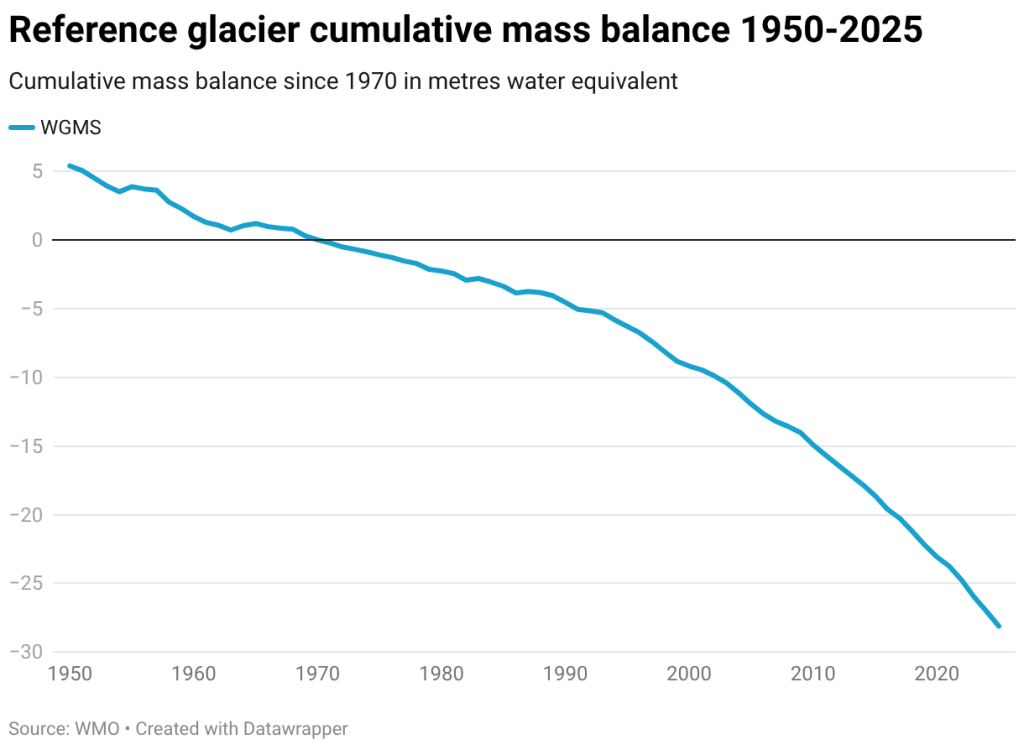 ‘ဇလဗေဒနှစ်’ကို အောက်တိုဘာ ၁ မှ စက်တင်ဘာ ၃၀ အတွင်းဟု သတ်မှတ်ထားသည်။ ၂၀၂၄-၂၀၂၅ ဇလဗေဒနှစ်အတွင်း ရေခဲမြစ်ဒြပ်ထုအတိုးအလျော့ဆိုင်ရာအချက်အလက်များကို အတည်မပြုနိုင်သေးချေ။ သို့သော် ယင်းကာလအတွင်း၌ ကမ္ဘာ့ရေခဲမြစ်ဒြပ်ထုသည် သိသာစွာ လျော့နည်းလာနေကြောင်း အထောက်အထားများ ရှိသည်။ ကမ္ဘာအနှံ့တွင် နှစ်စဉ်စံပြုလေ့လာနေခဲ့သည့် ရေခဲမြစ်ပေါင်း ၁၇၀ ခန့်အနက် ၁၅၅ ခု၏ ဒြပ်ထုများသည် လွန်ကဲစွာ လျော့နည်းလာနေသည်ဟု သိရသည်။