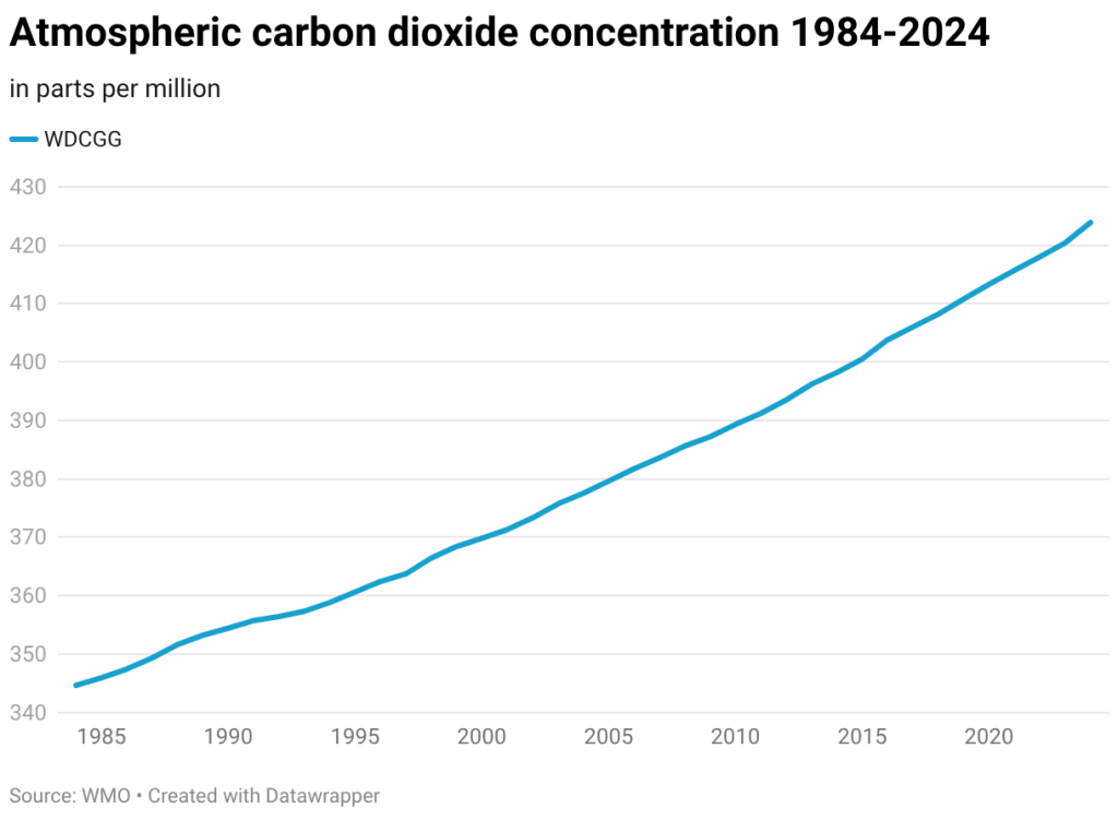 ၂၀၂၄ ခုနှစ် လေထုတွင်းရှိ ကာဘွန်ဒိုင်အောက်ဆိုက်၊ မီသိန်းနှင့် နိုက်ထရပ်စ်အောက်ဆိုက် ပမာဏသည် လွန်ခဲ့သောနှစ်ပေါင်း ၈၀ဝ ဝဝဝ အတွင်း အမြင့်မားဆုံးဖြစ်သည်။