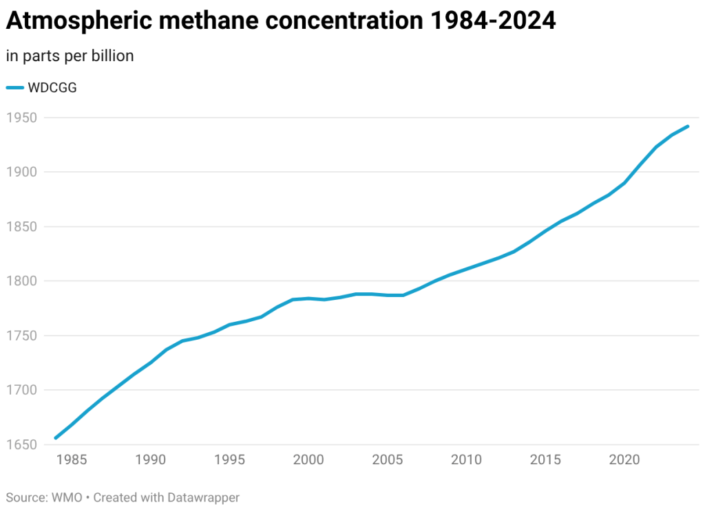 မီသိန်း(methane)သည် ပူနွေးစေရာတွင်နှင့် ရာသီဥတုပြောင်းလဲစေရာတွင် ကာဘွန်ဒိုင်အောက်ဆိုက်ပြီးလျှင် အန္တရာယ် အများဆုံးဓာတ်ငွေ့ဖြစ်သည်။ မီသိန်းပမာဏသည် ၂၀၂၄ ခုနှစ်၌ ထုထည်အားဖြင့် ၁၉၄၂ ပီပီဘီသို့ ရောက်ရှိရာ ၁၇၅၀ ပြည့်နှစ်ကထက် ၂၆၆ ရာခိုင်နှုန်း များပြားလာသည်။