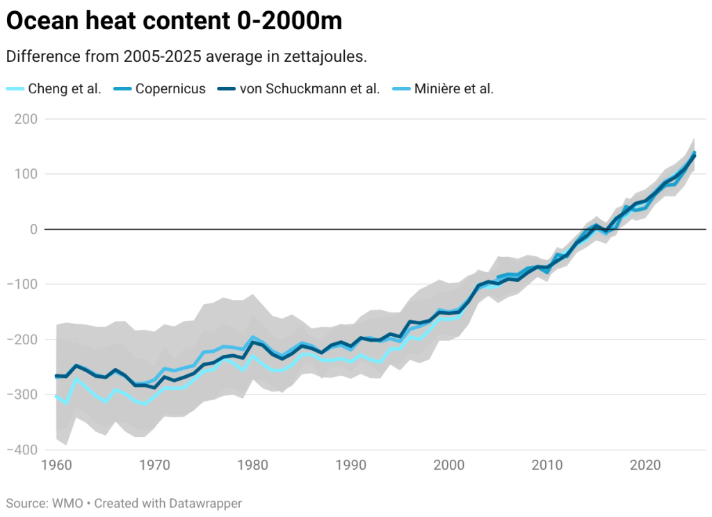 ၂၀၂၅ ခုနှစ်၌ သမုဒ္ဒရာရေထု(ရေမျက်နှာပြင်မှ မီတာ ၂၀ဝ၀ အနက်အထိ)အတွင်း ရောက်ရှိနေသောာ စွမ်းအင်(အပူဓာတ်)ပမာဏသည် ၂၀၂၄ ခုနှစ်ကထက် ၂၄ ဇက်တာဂျူးလ်(zettajoule)ပိုလာခဲ့သည်။ ယင်းဂဏန်းသည် တိုင်းတာမှတ်တမ်းတင်မှုများ လုပ်ဆောင်ခဲ့သည့် ၆၆ နှစ်အတွင်း အများဆုံးဖြစ်သည်။ ၂၀ဝ၅-၂၀၂၅ ခုနှစ်အတွင်း ရေထုအပူချိန်တက်နှုန်းသည် ၁၉၆၀-၂၀ဝ၅ ခုနှစ်အတွင်း တက်နှုန်းထက် နှစ်ဆကျော် မြန်ဆန်သည်။
