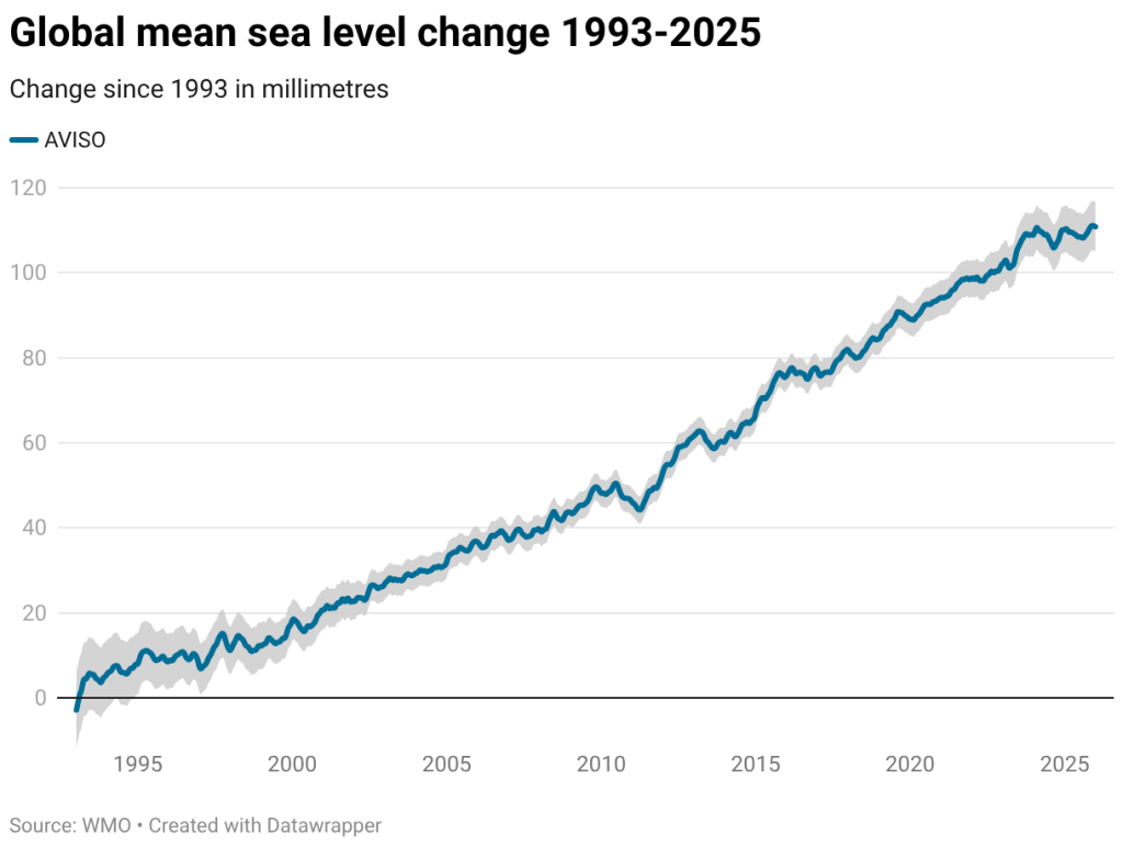 ၁၉၉၃ ခုနှစ်အစပိုင်းနှင့် နှိုင်းယှဉ်လျှင် ၂၀၂၅ ခုနှစ်အကုန်တွင် ပင်လယ်ရေပြင်သည် ၁၁ မီတာခန့် မြင့်တက်ခဲ့သည်။