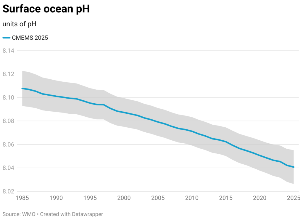 ၁၉၈၅ ခုနှစ်နှင့် ၂၀၂၅ ခုနှစ်ကြား သမုဒ္ဒရာရေထု၏ ပီအိပ်ချ်ယူနစ်သည် ဆယ်စုနှစ်တစ်ခုလျှင် ဝ ဒသမ ဝ၁၇ နှုန်းဖြင့် ကျဆင်းလာခဲ့သည်။