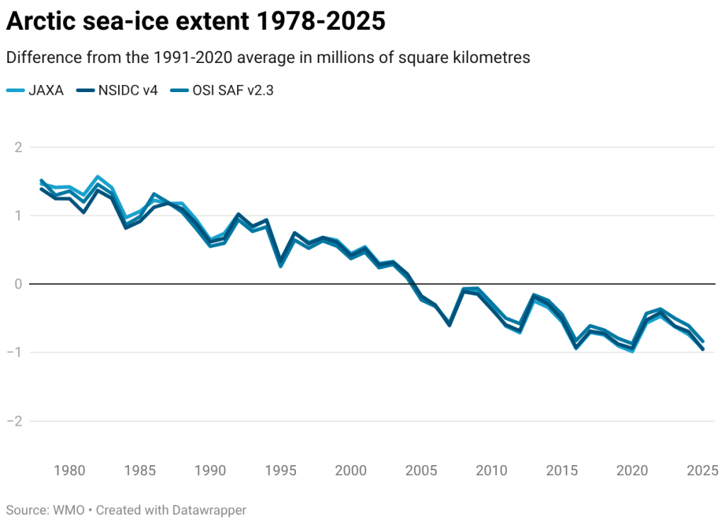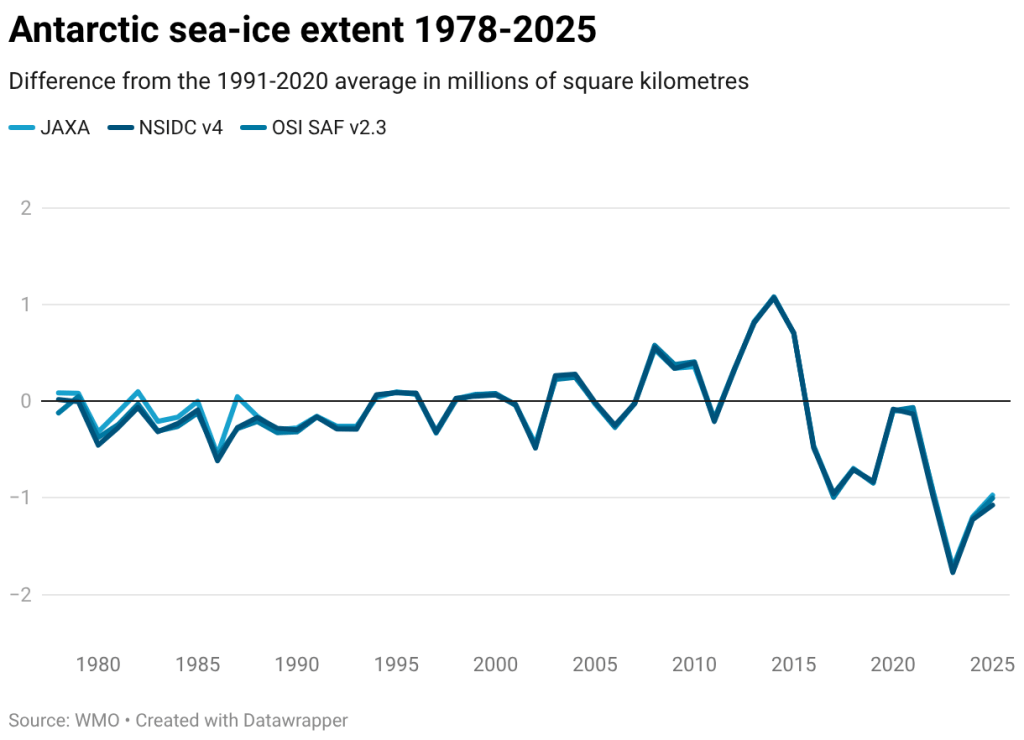 အလားတူ အန္တာတိတ်ပင်လယ်ရေခဲပြင်၏ နှစ်စဉ်ပျမ်းမျှအကျယ်အဝန်းသည် ၂၀၂၅ ခုနှစ်တွင် စတုရန်းကီလိုမီတာ ၁၀ ဒသမ ၈၁ သန်း ရှိရာ တိုင်းတာခဲ့သည့်နှစ်များအတွင်း တတိယအနည်းဆုံး အကျယ်အဝန်း ဖြစ်သည်။