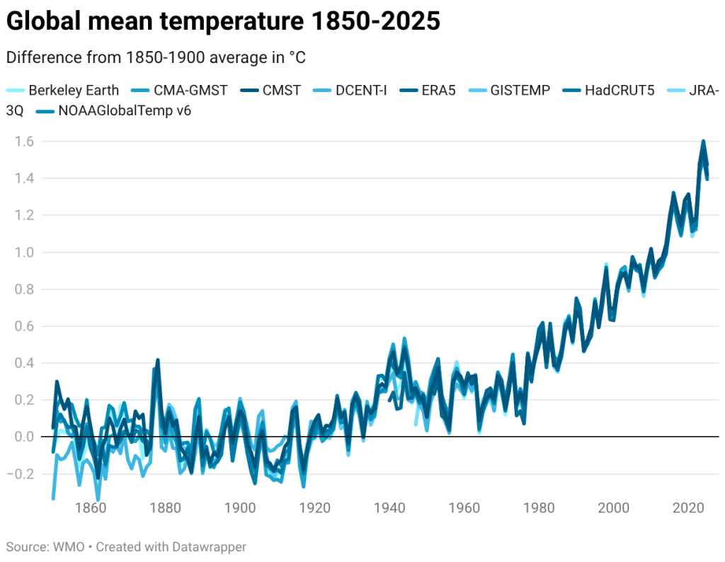ကုန်းမြေထုနှင့်သမုဒ္ဒရာရေထု နှစ်ခုလုံး၏ အပူချိန်များကို တိုင်းတာနိုင်ခဲ့သည့် ၁၇၆ နှစ်ကာလအတွင်း လွန်ခဲ့သောသုံးနှစ်သည် အပူပြင်းဆုံးနှစ်များ ဖြစ်ကြသည်။ တိုင်းတာသောဌာနပေါ်မူတည်ပြီး ၂၀၂၅ ခုနှစ်သည် ဒုတိယ သို့မဟုတ် တတိယအပူဆုံးနှစ် ဖြစ်သည်။ ၂၀၂၄ ခုနှစ်သည် အပူဆုံးနှစ် ဖြစ်ခဲ့သော်လည်း လာနီညာအခြေအနေကြောင့် ၂၀၂၅ ခုနှစ်တွင် အပူလျော့ခဲ့သည်။